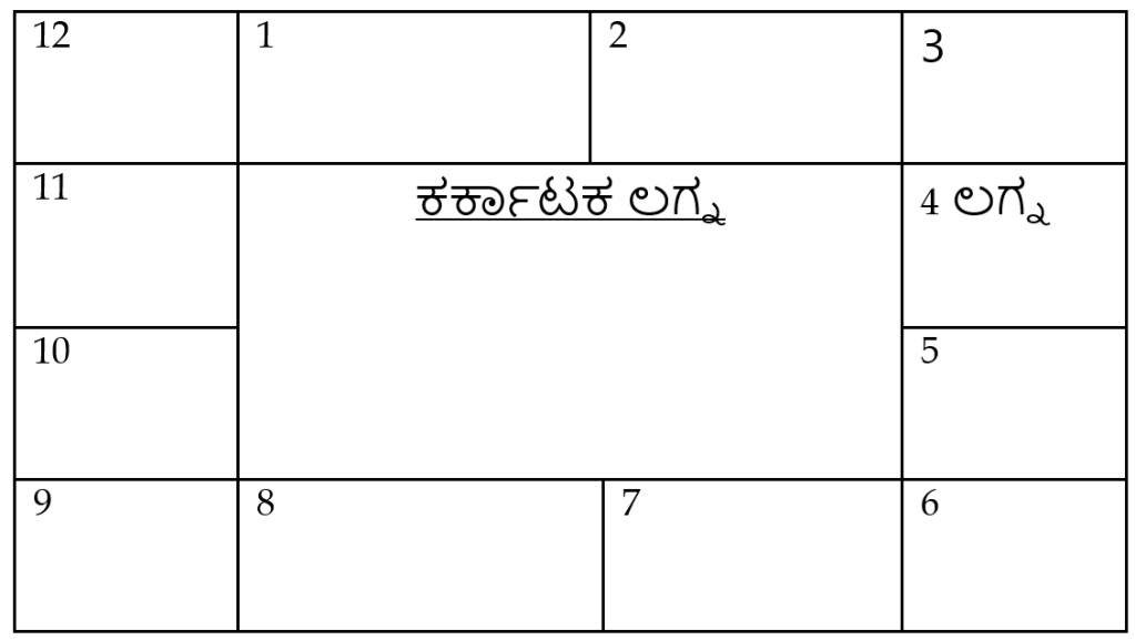 ದಕ್ಷಿಣ ಭಾರತದಲ್ಲಿ ಸ್ಥಿರ ಅಥವಾ ನಿರಯನ ಕುಂಡಲಿಯಲ್ಲಿ ಕರ್ಕಾಟಕ ಲಗ್ನದ ಜಾತಕ (ಕುಂಡಲಿ) ಈ ರೀತಿಯಾಗಿ ಕಾಣುತ್ತದೆ.